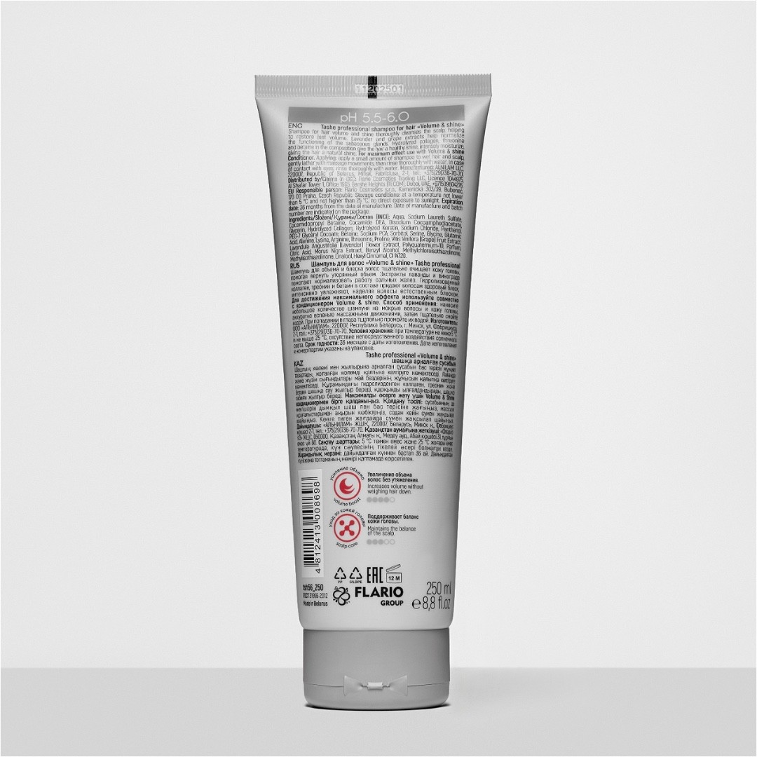 Шампунь Volume & shine возвращает волосам плотность, повышает эластичность прядей и дарит прикорневой объем, запечатывает и восстанавливает поврежденные волосы, усиливая природный блеск.